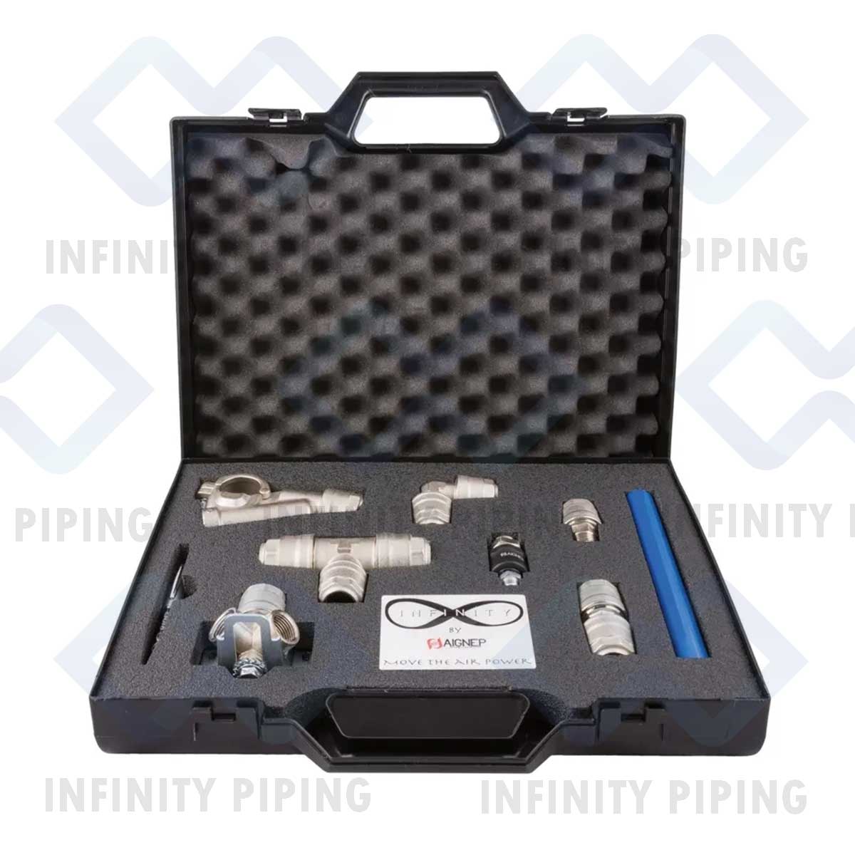 Packed into a professional, heavy-duty carrying case, this kit puts the actual product in your customer’s hands. It allows them to feel the weight of the aluminum, test the push-to-connect mechanism themselves, and see the internal engineering that makes Infinity the market leader in compressed air piping.