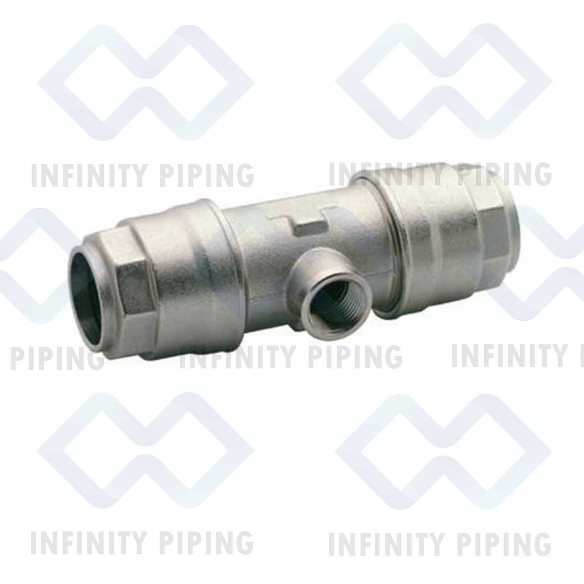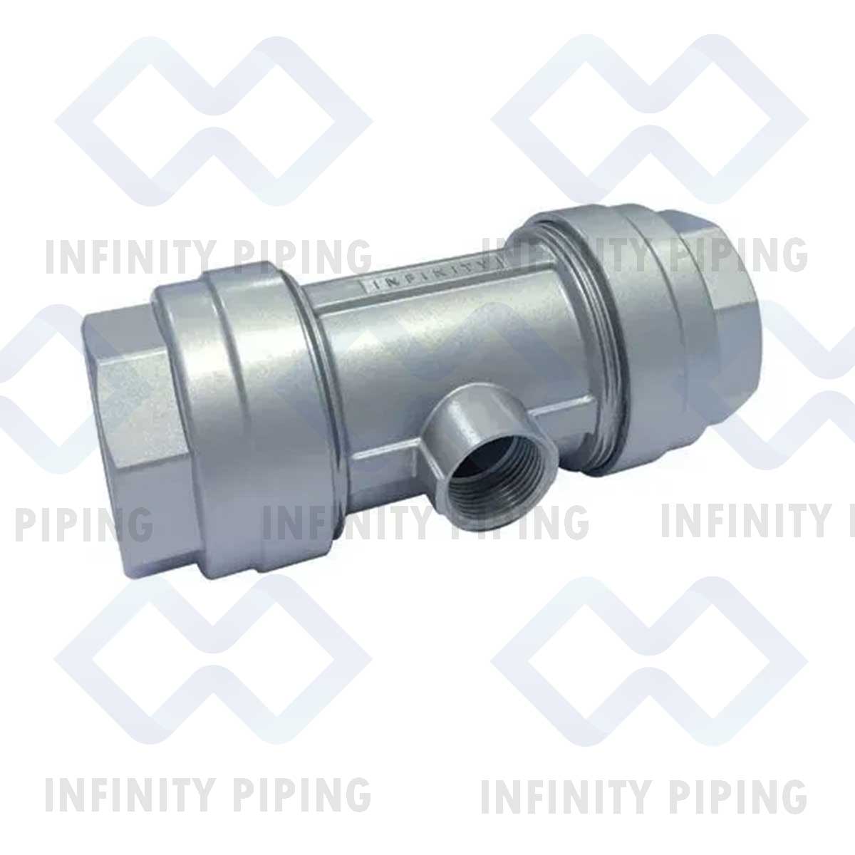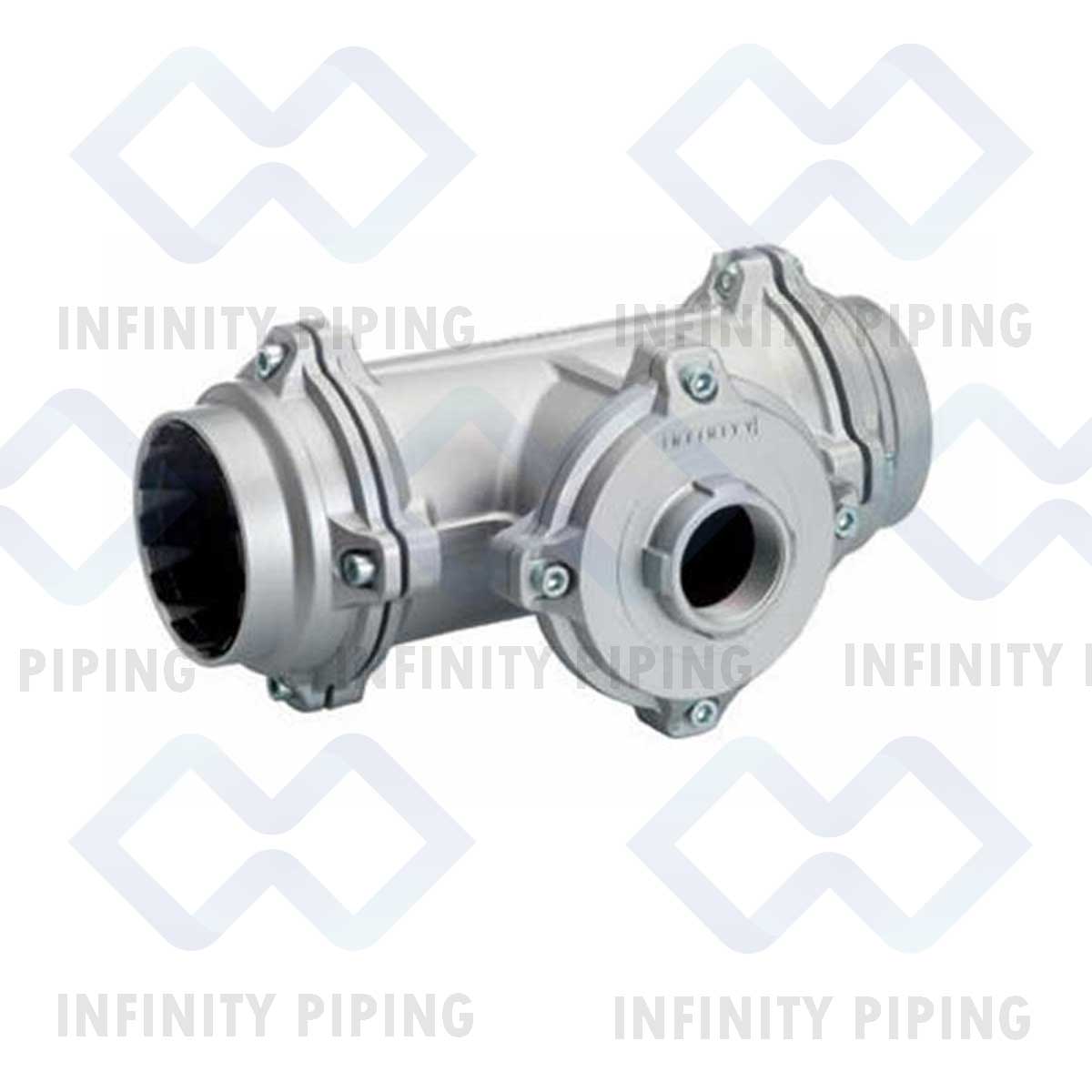 Streamline your Infinity Aluminum Piping System by integrating threaded accessories directly into your main line with the Infinity Female NPT Outlet Reducing Tee. Unlike standard tees that branch off to another tube, this specialized fitting features a Female NPT threaded outlet in the center.